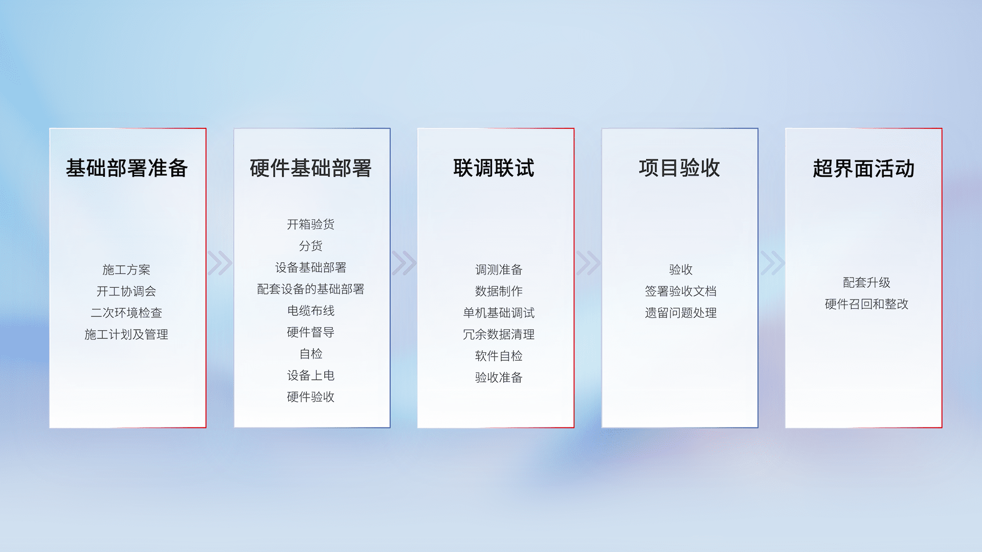 从基础部署准备、、、硬件基础部署、、、联调联试、、、、项目验收、、、、越界面活动的全过程可追溯,,保证施工质量和进度。。。。
